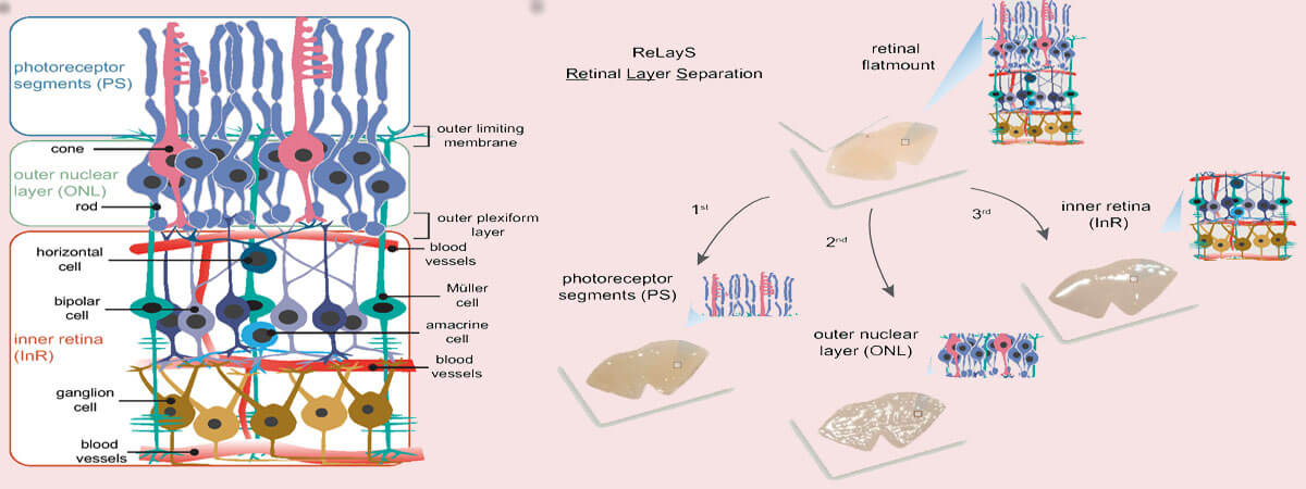 Here we introduce a simple method for retinal layer separation (ReLayS) from mouse eyes that efficiently and reproducibly isolates three fractions that contain the photoreceptor inner and outer segments (PS), the outer nuclear layer (ONL), and the inner retina (InR) with all other layers. Samples prepared with the ReLayS method from individual half-retinas provide sufficient material for Western blotting or real-time PCR, allowing the study of the subcellular molecular composition of photoreceptors. The ReLayS method was validated by Western blotting and quantitative RT-PCR using several representative proteins and genes for photoreceptor compartments and different retinal cell types.